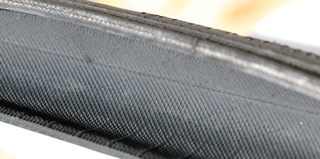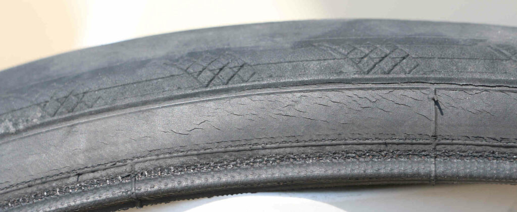 - Apparitions rapides de micro-fissures/craquelures sur le côté. Vu de l’intérieur, le pneu est encore en parfait état, mais cela ne m’inspire pas confiance. Je n’ai pas d’expertise, mais je ne veux pas prendre le risque que cela se déchire (même si la face intérieure à l’air en parfait état).