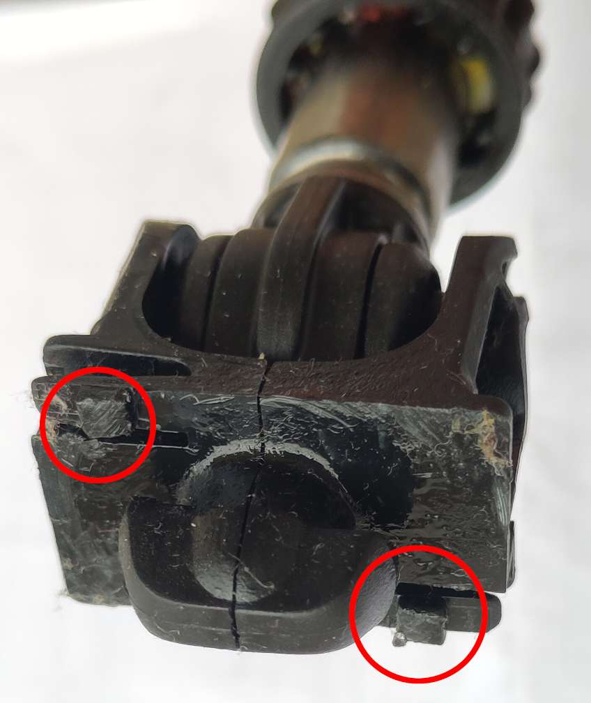 Dans une autre vidéo, quelqu’un recommandait d’enlever le capot supérieur pour inspecter le ressort (situé vers le haut) et pour avoir une prise, et d’utiliser des gants de sécurité. Je l’ai fait. - Pour décrocher l’amortisseur existant, il faut le faire tourner de 90° pour que les « crochets » arrêtent de le maintenir respectivement à la carcasse et au tambour. Mais pour pourvoir le tourner, il faut pousser (par exemple avec un tournevis plat) pour chaque côté deux petits bitoniaux qui empêchent la rotation (vous pourrez les observer plus facilement sur la nouvelle pièce).