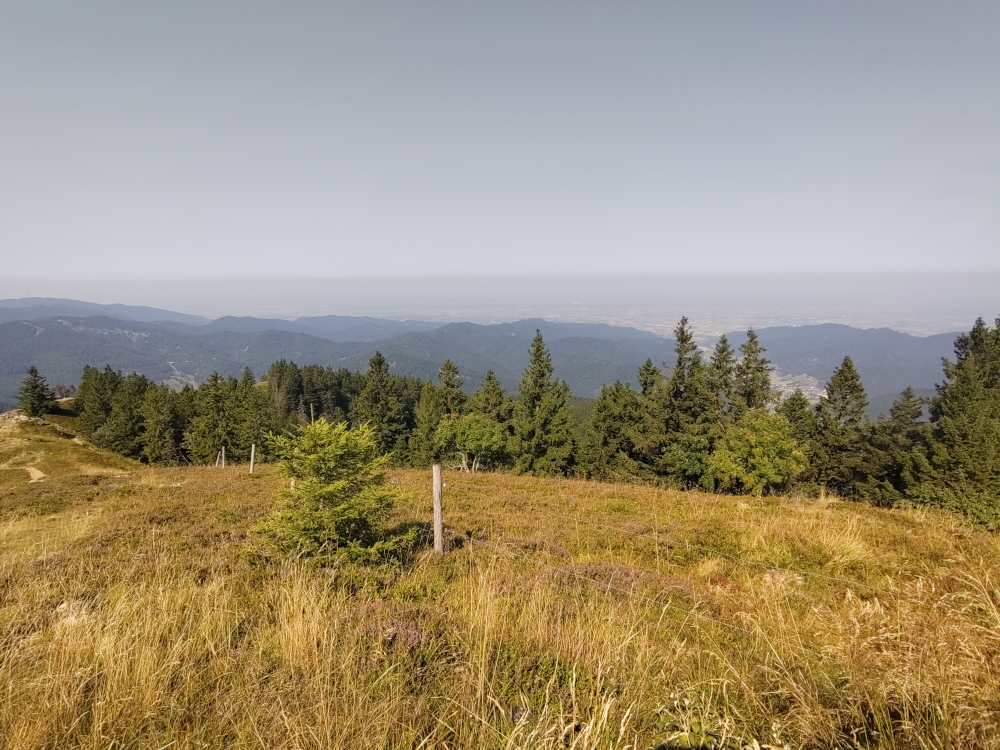 Belchen est un autre point de vue fameux du coin, d’où on voit également la plaine à l’ouest (un peu moins bien qu’à Schauinsland) et vers les collines à l’est. On peut s’économiser les derniers 250 m+ en montant (avec son vélo si on veut) avec une télécabine. En haut, à nouveau de belles vues (à 360°, mais un peu embrumées et une végétation un peu sèche), un resto simple et une bonne petite balade à pied pour monter au sommet. On peut ensuite redescendre à vélo sur une route goudronnée.