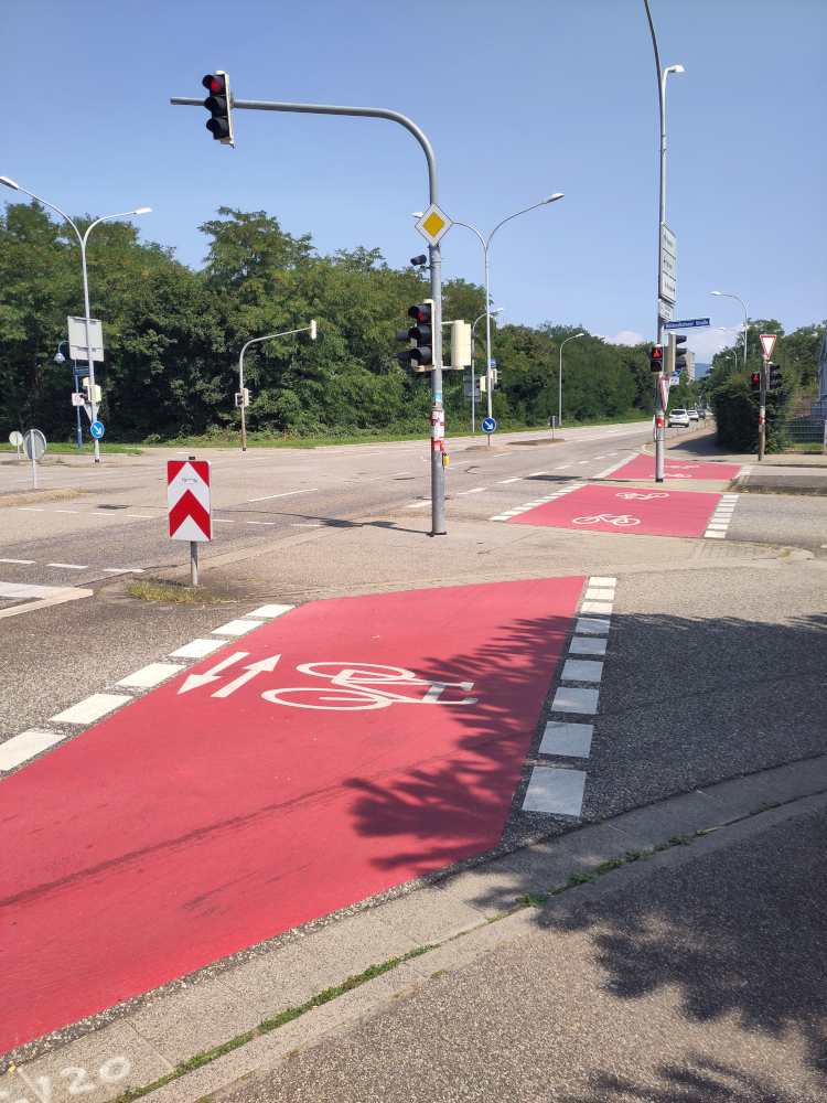 Un équipement bien agréable: les pistes cyclables peintes en rouge aux intersections qui permettent de voir du premier coup d’œil où continue la piste.